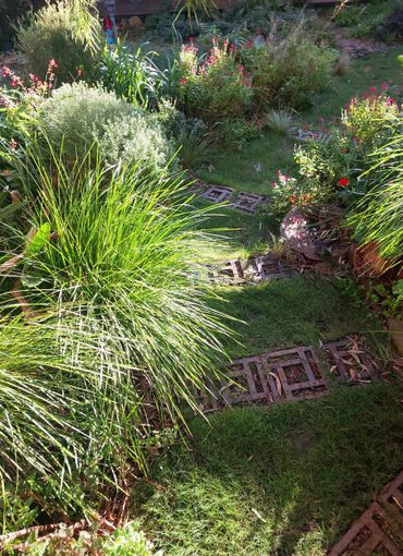 Salvaged concrete pavers and sandstone found on site form steppers through the garden.